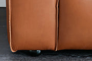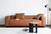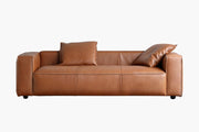 The Pomona deep seat sofa combines a minimalist aesthetic with ultimate comfort. It features a blocky, low-profile design with a low backrest and wide arms, making it a stylish addition to any living room. Crafted with brown leather, this sofa is not only luxurious but also durable and easy to clean. The solid trim around the edges adds sophisticated detail for an elegant look.With its deep seat design and bouncy cushions, the Pomona sofa is ideal for casual relaxation or napping. We're sure you'll experience the perfect blend of comfort and simplicity with the Pomona.